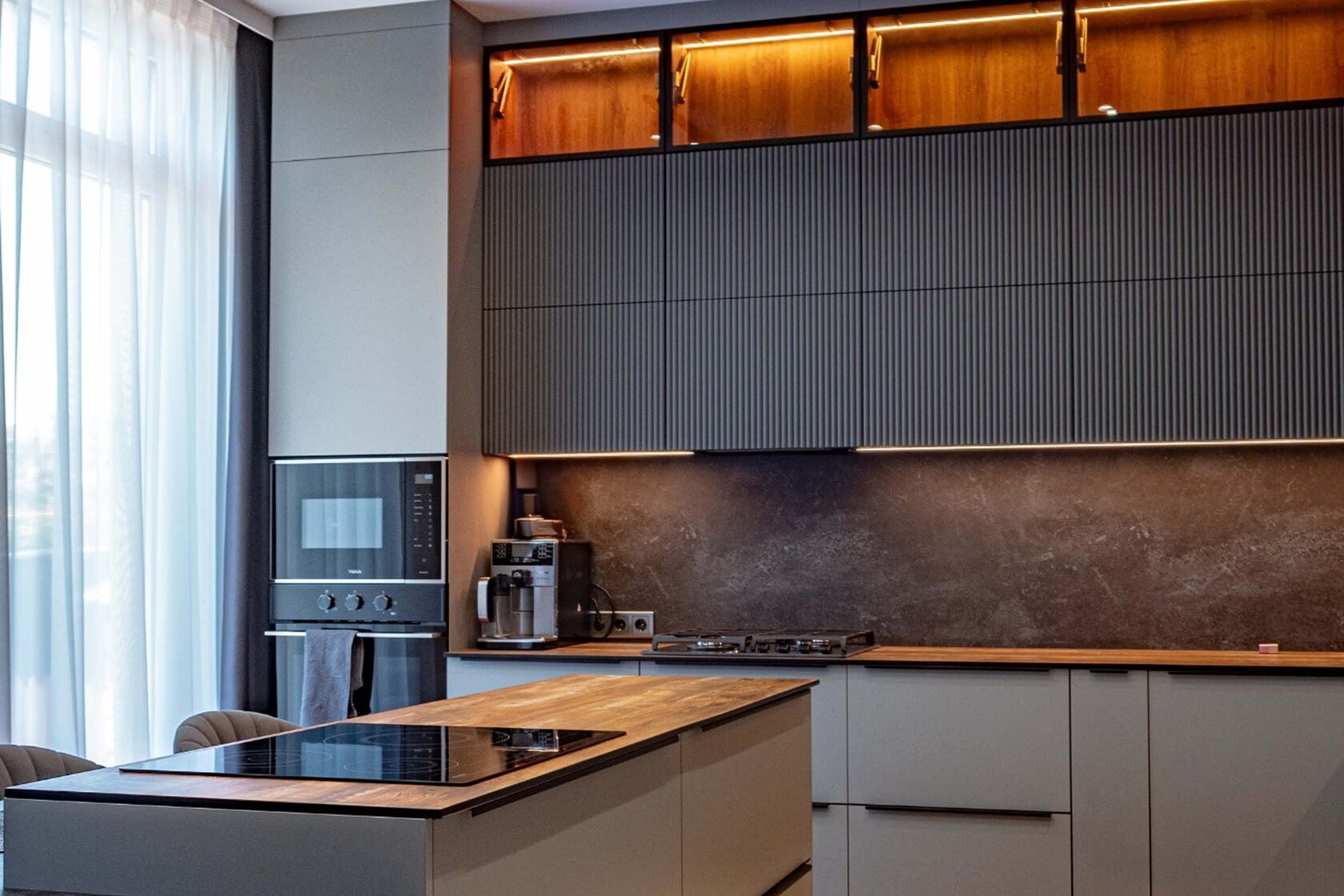 Сочетания материалов — актуальны комбинации дерева с металлом, камня с текстилем, стекла с экокожей. В тренде рифленые фасады из МДФ, гладкие и матовые поверхности, а также натуральные и экологичные материалы