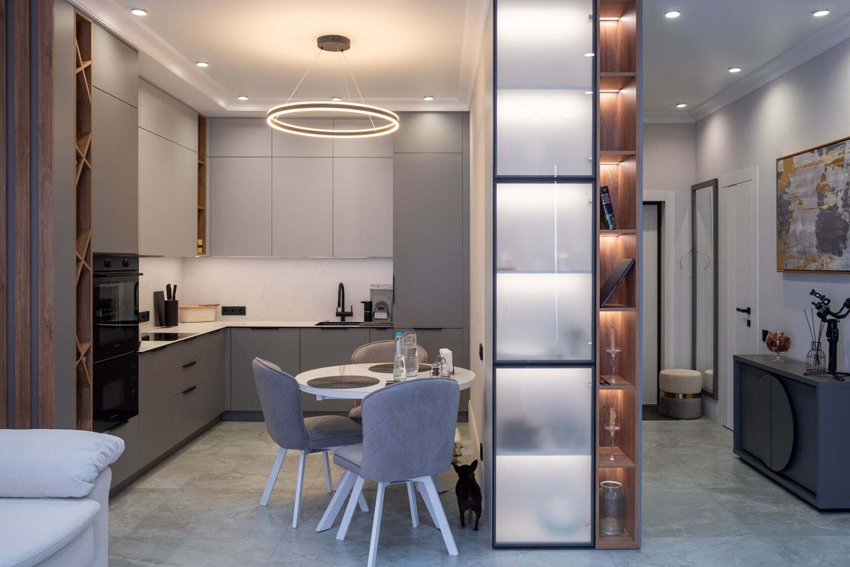 Закрытые системы хранения — все лишнее скрыто за фасадами, бытовая техника максимально интегрирована